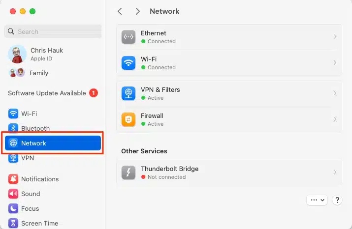 - Click on the “Network” menu option in the left-hand pane.