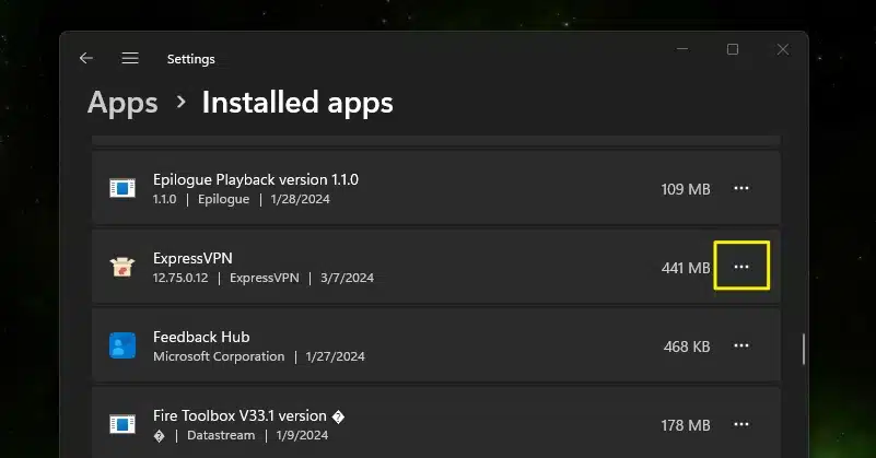 - You’ll now be taken to a list of all your Windows programs. Locate ExpressVPN and click on the three dots (…) to the right of the ExpressVPN label.